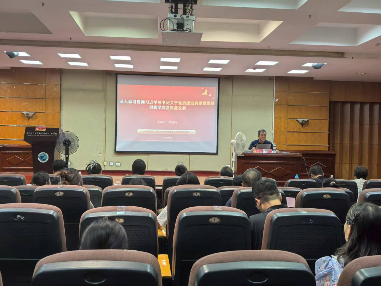 李国林以《深入学习贯彻习近平总书记关于党的建设的重要思想引领学院高质量发展》为题,从“深入领会习近平总书记关于党的建设的重要思想”“以党的政治建设为统领,加强高校党建工作”“立足实际,以党建引领学院内涵式发展突围”三个方面进行了专题辅导报告,要求参训学员以习近平总书记关于党的建设的重要思想为指引,以“事事紧抓不放”的执行力,把党建优势转化为攻坚克难的制胜优势,奋力跑出学院高质量发展加速度,为湖北支点建设交出无愧于时代的邮电答卷。 辅导报告结束后,举办了2025年暑期中层干部素质能力提升培训班结业式。李国林用三个“读懂”与全体参训学员共勉:一是读懂“我们是谁”——做破晓时分的点灯人,更做穿云破雾的领头雁。二是读懂“我们该做什么”——当知行合一的答卷人,更做躬身笃行的实干者。要把“围绕学生、关照学生、服务学生”融入日常运行,把“管理精度”转化为“育人温度”。要把“学习教育”和“六大行动”要求落到具体,在各自岗位上勤学善做,发光发热。三是读懂“我们该注意什么”——做心有戒尺、群众满意的明白人。要以“时时放心不下”的责任感纠治形式主义、官僚主义,做到“问题不解决不松劲、解决不彻底不放手、群众不认可不罢休”。 本次暑期中层干部素质能力提升培训班借智借力,主要依托武汉工程大学聘请的优质师资力量开展干部培训,有效提升了培训的实效性,着力推动深入贯彻中央八项规定精神学习教育走深走实。培训期间,湖北省委党校、中南财经政法大学及学校职能部门负责人等专家学者围绕《牢记嘱托,建成支点——湖北“新春第一会”精神解读》《弘扬“大别山精神、抗洪精神、抗疫精神”》《党政机关厉行节约反对浪费条例》解读等内容进行了授课,课程紧扣深入贯彻中央八项规定精神学习教育,涵盖党的创新理论知识,纪法教育等内容。