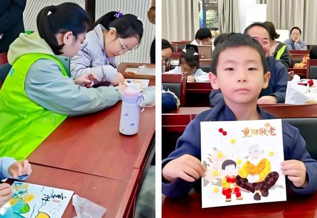 随后,志愿者们组织社区儿童开展重阳主题手工活动。孩子们在志愿者指导下认真制作粘贴画,运用彩纸、布料等材料,精心描绘寿桃、全家福等饱含敬老心意的图案。手工制作完成后,孩子们将作品赠予爷爷奶奶及社区长者,并逐一向长辈讲解作品寓意。有的孩子以“爷爷奶奶陪我长大”为主题绘制温馨场景,有的则写下“健康长寿”的真挚祝福。