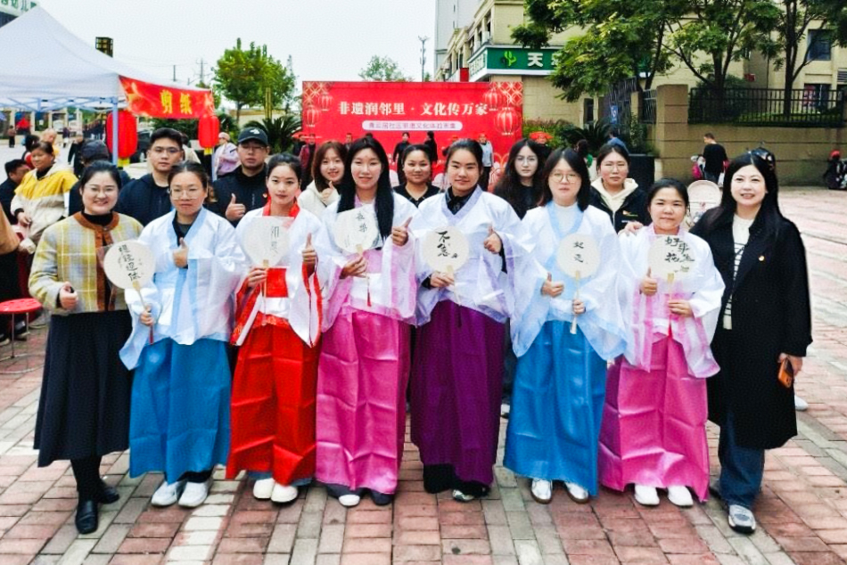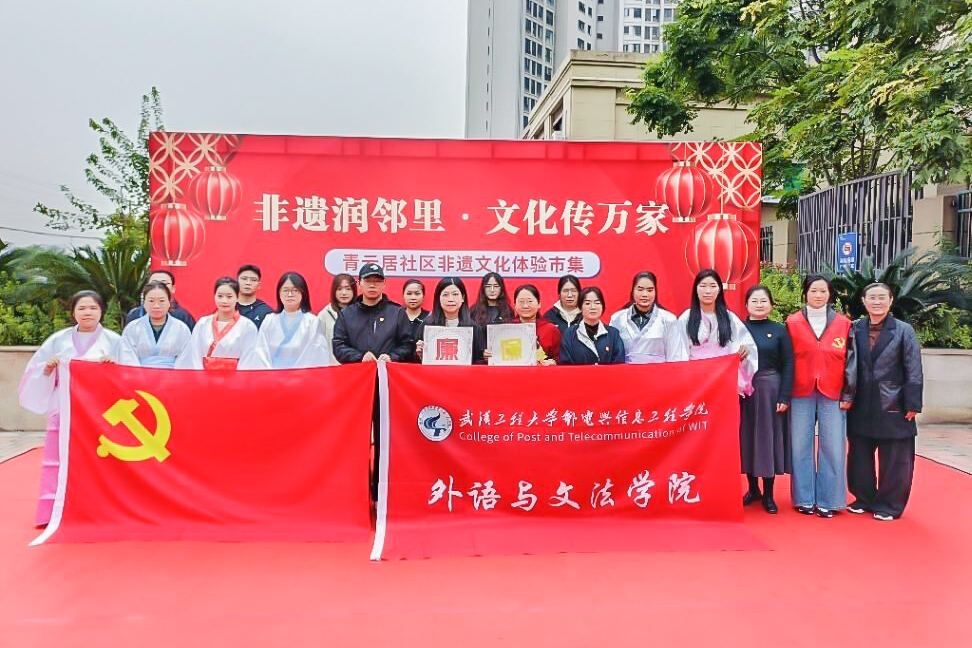 (通讯员 吴丹)为深入贯彻习近平总书记关于传承和弘扬中华优秀传统文化的重要论述,推动党建引领与传统文化保护的深度融合,外语与文法学院第二党支部于10月27日下午与武汉市青山区青云居社区联合举办了“非遗蕴廉心 文化共传承”主题党日活动。此次活动以非遗文化沉浸式体验为载体,将清廉文化建设与中华优秀传统文化的传承紧密结合,进一步激发了支部党员传承红色基因、守护文化根脉的责任感和使命感。 (一)活动主题 非遗蕴廉心 文化共传承 (二)参与人员 外语与文法学院党总支副书记郭咪咪、教工第二党支部党员和“语”路同行志愿服务队成员。 (三)活动纪实 2025年10月27日下午,外语与文法学院教工第二党支部党员教师带领“语”路同行志愿服务队,赴武汉市青山区青云居社区开展非遗文化体验市集活动。
