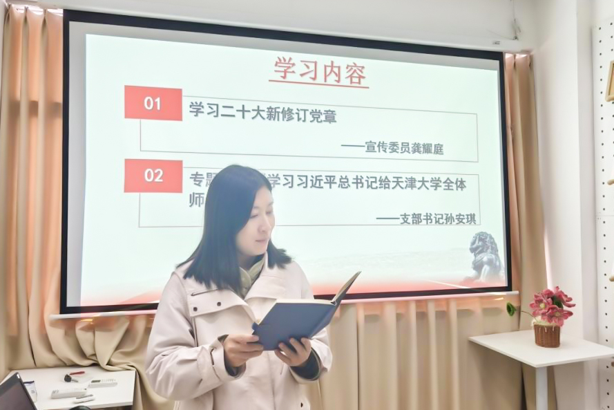 孙安琪以《习近平给天津大学全体师生的回信》为题,讲授专题党课。她表示,该回信深刻强调了坚持新时代中国特色社会思想的指导地位,为基层党建工作指明了方向。围绕总书记提出的“提高人才培养质量”这一核心要求,要坚定不移地落实立德树人根本任务,深度挖掘专业课程中蕴含的思政育人元素,与思政课程同向同行,构建更加完善的“大思政”育人体系,以扎实的教育教学成果助力高质量人才培养。
