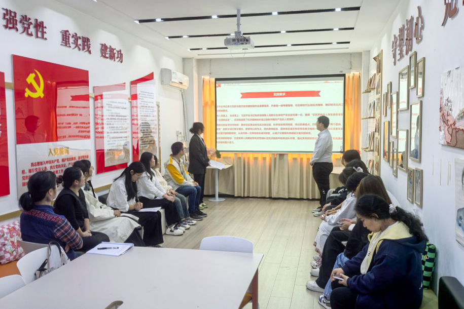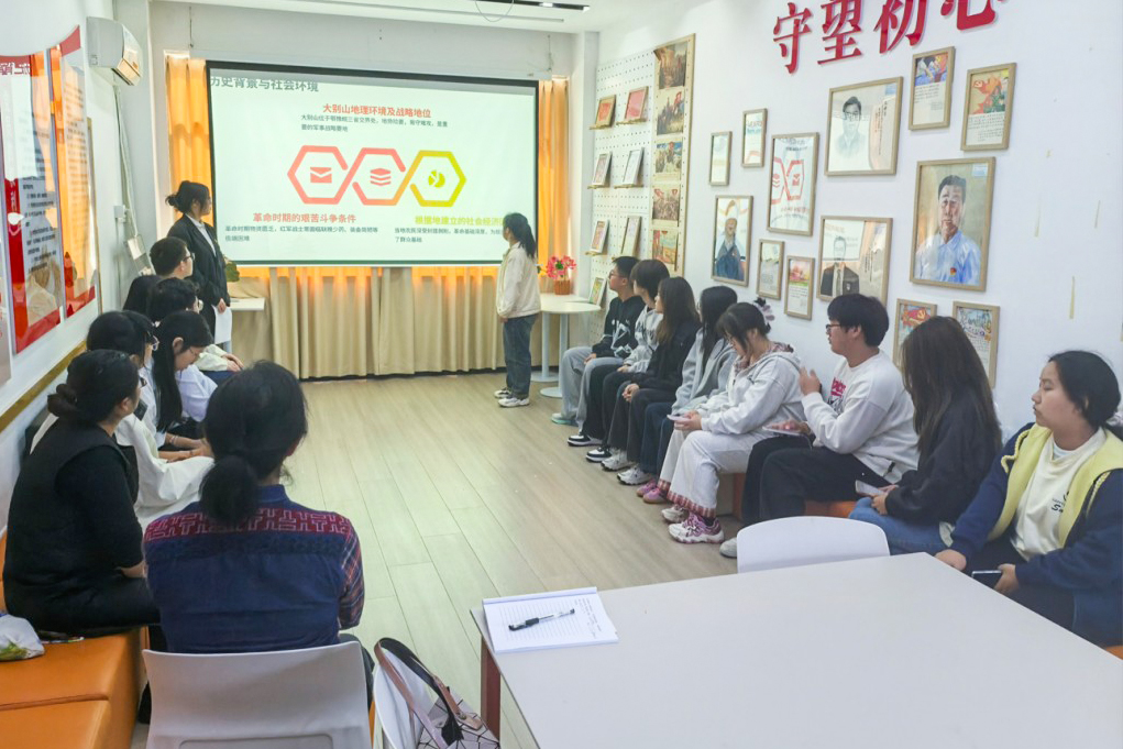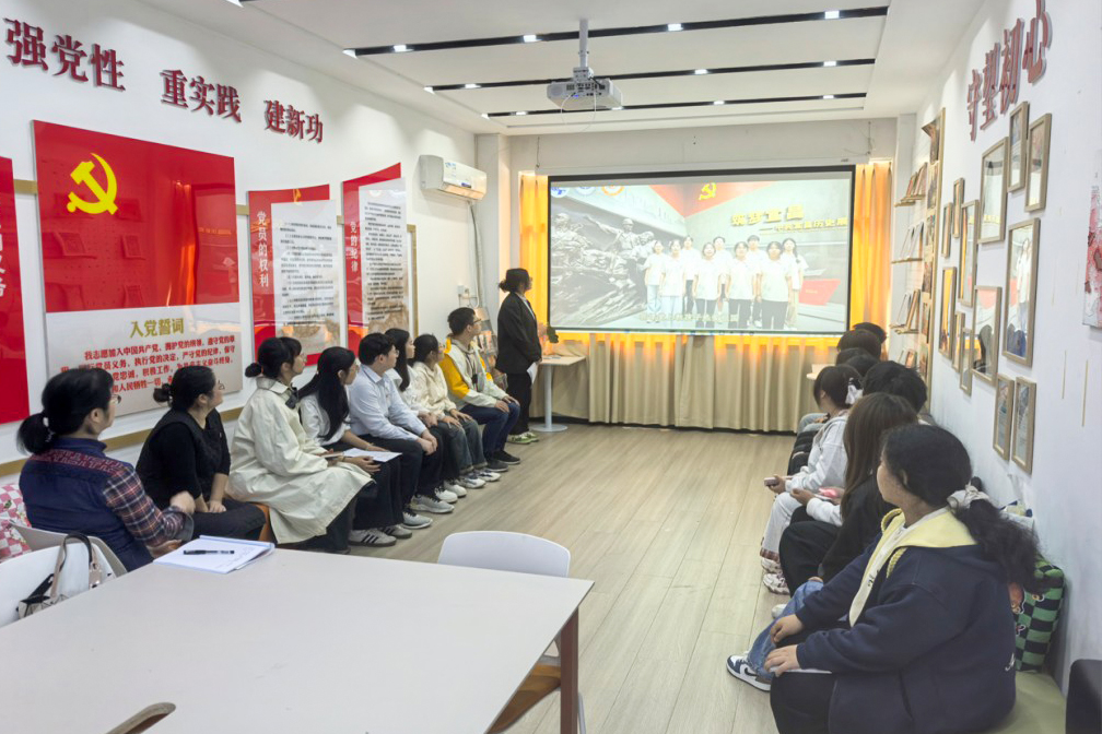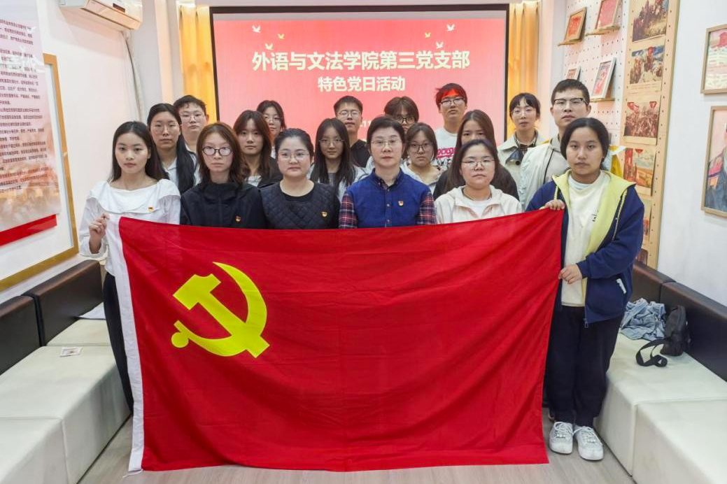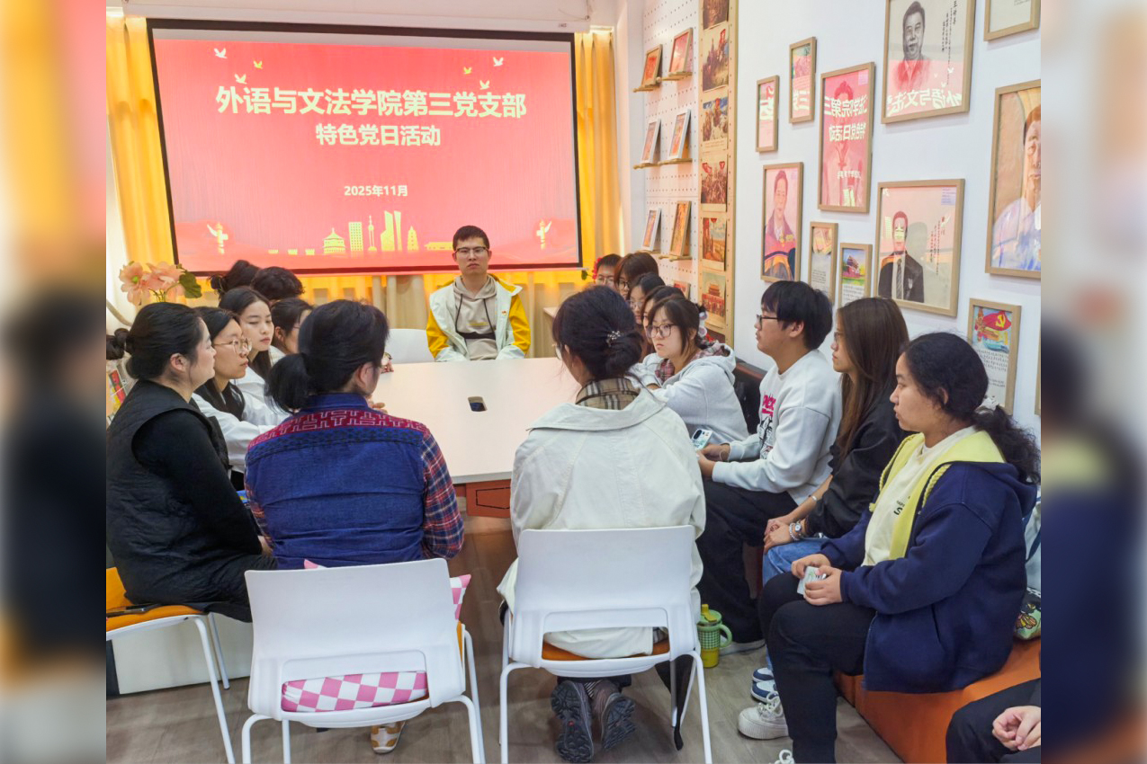 (通讯员 尹珊 杨依雪 摄影 孙历恒)为引导青年党员坚定政治自觉,矢志不渝听党话、跟党走,在学思践悟中凝聚奋进力量,争做新时代有为青年。2025年11月5日,外语与文法学院第三党支部在党群服务中心举办“赓续红色血脉,激扬青春担当”特色党日活动。 (一)活动主题 赓续红色血脉 激扬青春担当 (二)参与人员 组织员张蕾、外语文法学院党总支副书记郭咪咪、第三党支部支部书记尹珊、党员代表及2025级学生代表。 (三)活动纪实