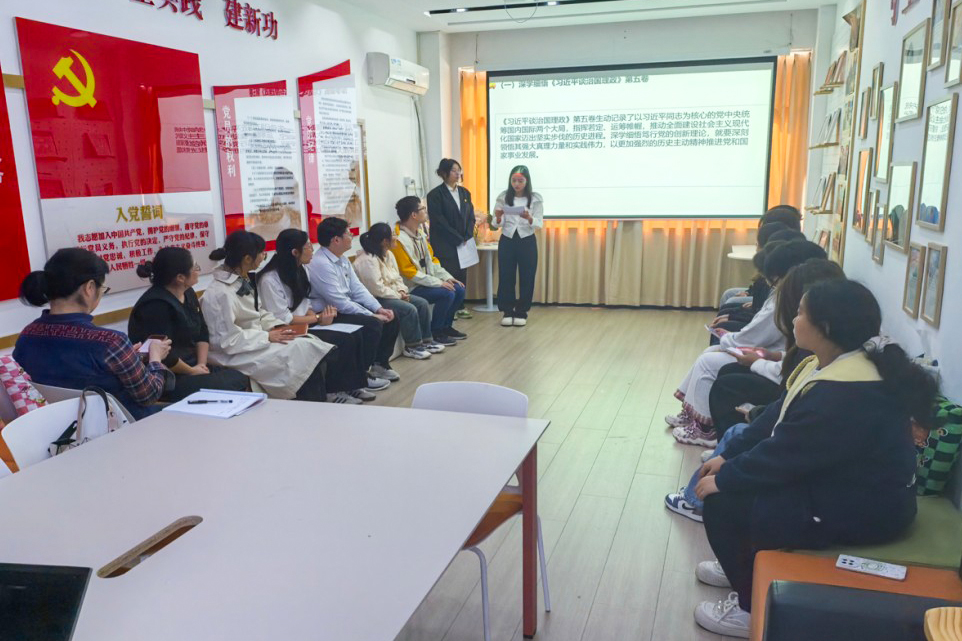 深学理论著作 筑牢思想根基 党员李庆芳领学了《习近平谈治国理政》(第五卷)的相关篇章。她从外语与文法的专业视角出发,倡导将理论学习与专业实践紧密结合,号召青年党员积极参与文体活动和社会实践,充分发挥先锋模范作用,展现新时代青年蓬勃向上的朝气和昂扬向上的精神风貌。