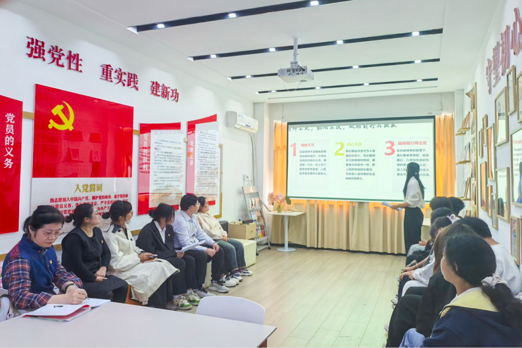 重温红色记忆 感悟初心使命 活动在庄严的国歌声中拉开帷幕,学生党员谢雨晗带领全体党员重温入党誓词。铿锵有力的誓词不仅增强了组织的凝聚力,更激发了党员们敢于担当、砥砺奋进的精神力量,推动他们将誓言内化于心、外化于行。 随后,全体人员集体观看了理论宣讲视频《峡江上的传承》。“语”路同行理论宣讲团的党员及入党积极分子,在实践中深刻感悟革命先辈的奋斗历程与共产党人的精神血脉。他们通过社区宣讲、群众帮扶等志愿行动,追寻宜昌三峡的红色足迹,将理论学习与服务人民紧密结合,使“志愿红”“党建红”与“传承红”同频共振,以实际行动诠释信仰的传承。