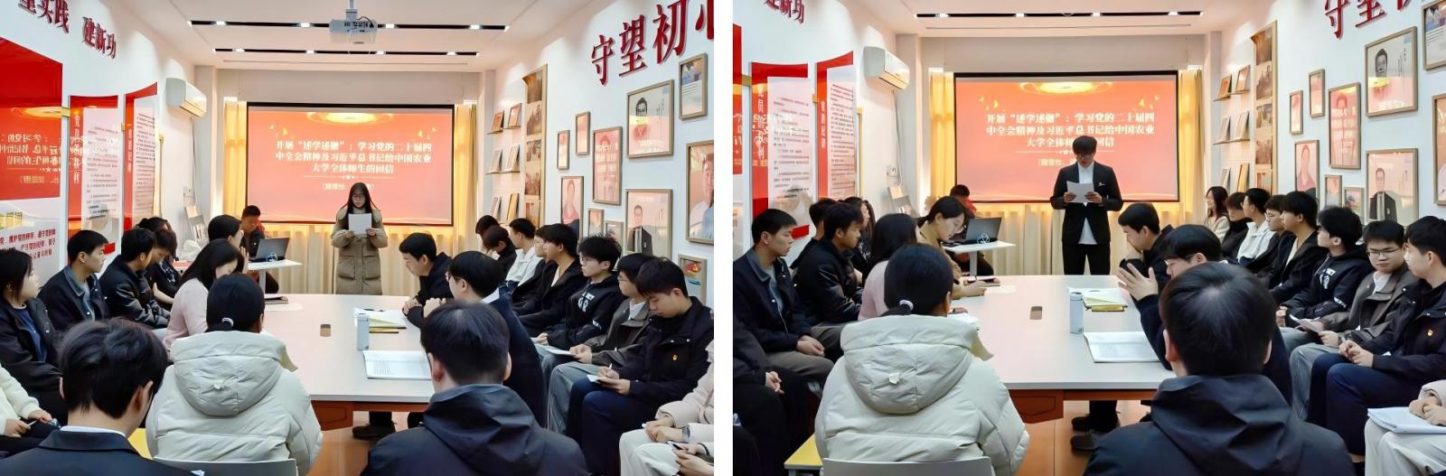 述学述做显担当 知行合一践使命 学生党员代表魏雪怡、梁国贵围绕党的二十届四中全会精神,结合习近平总书记给中国农业大学全体师生回信,分享“学思用贯通、知信行统一”的学习体会,提出“以匠心育匠人、以强基筑强国”的专业思考。