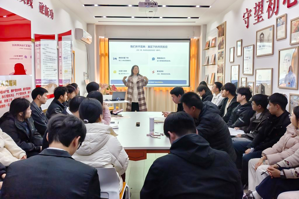 大学生心理健康中心主任严玲通过“压力曲线”互动体验,教授“1分钟正念呼吸法”“情绪ABC”等调适技巧,帮助同学们以稳定心态冲刺“研”途“最后一公里”。