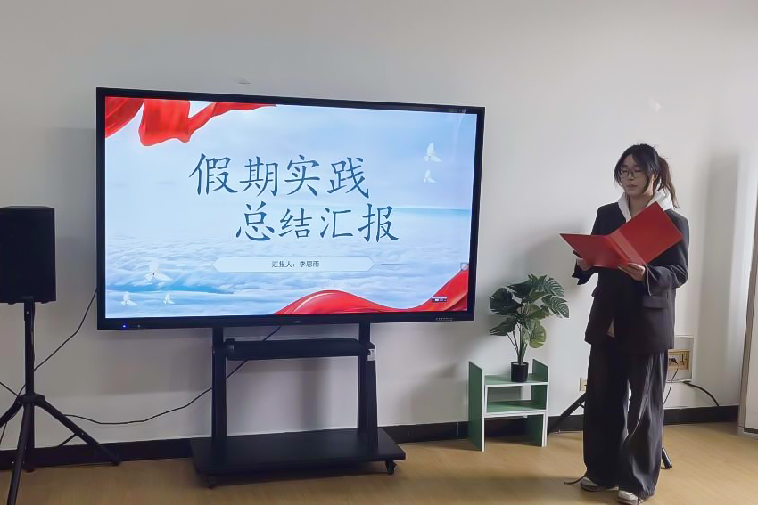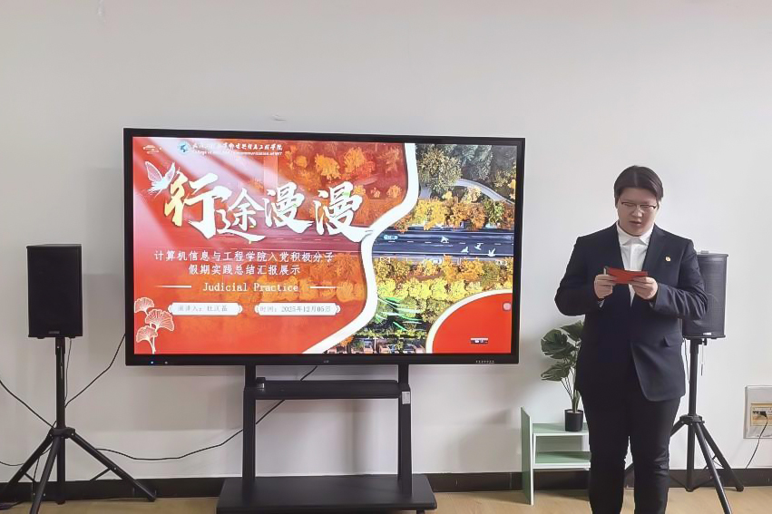 (三)活动纪实 2025年12月5日,计算机与信息工程学院党总支第三、第四、第五学生党支部在三教党员活动室举行“初心映实践 奋进新征程”主题党日活动。活动在庄严的国歌声中拉开帷幕,第四党支部书记李娜带领全体党员重温入党誓词。铿锵有力的誓言在活动室内回荡,激励着每一位同志铭记初心使命,强化责任担当。 活动进入重点环节——“星之队”志愿服务队实践展示汇报。各党支部精心推荐的入党积极分子代表依次登台,他们结合自身参与社区服务、技术帮扶、公益宣传等实践活动的经历,生动讲述了在实践过程中的所见所闻、所感所悟以及所学所获。青年学子用真实的故事、质朴的语言,展现了在服务社会中锤炼党性、践行宗旨的坚定步伐。他们将专业知识运用到实际服务中,帮助社区居民解决技术难题,传播公益理念,用实际行动诠释了“奉献、友爱、互助、进步”的志愿精神。现场气氛热烈,不时响起阵阵掌声,充分彰显了青年学子的青春风采与担当。