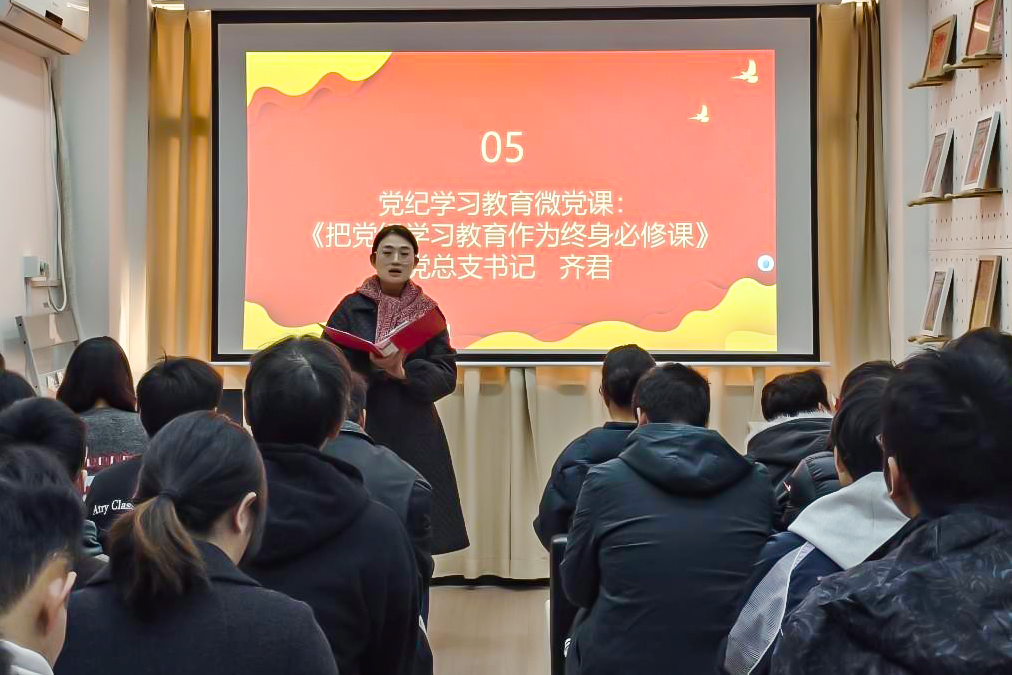 党务干事毛礼娜现场通报了12月份党费收缴情况,为全体党员详细解读了党费缴纳标准,重申了党费收缴工作的严肃性和重要性,强调交纳党费是党员应尽的基本义务,是检验党员组织观念的重要标尺。 党总支书记齐君以《把党纪学习教育作为终身必修课》为题讲授专题党课。她结合党纪学习教育的核心要求,从党纪学习教育的重要意义、重点内容和实践路径三个维度展开讲解,通过剖析典型案例,警示全体党员要时刻绷紧纪律之弦,做到知敬畏、存戒惧、守底线,将党纪学习教育融入日常、化作经常。