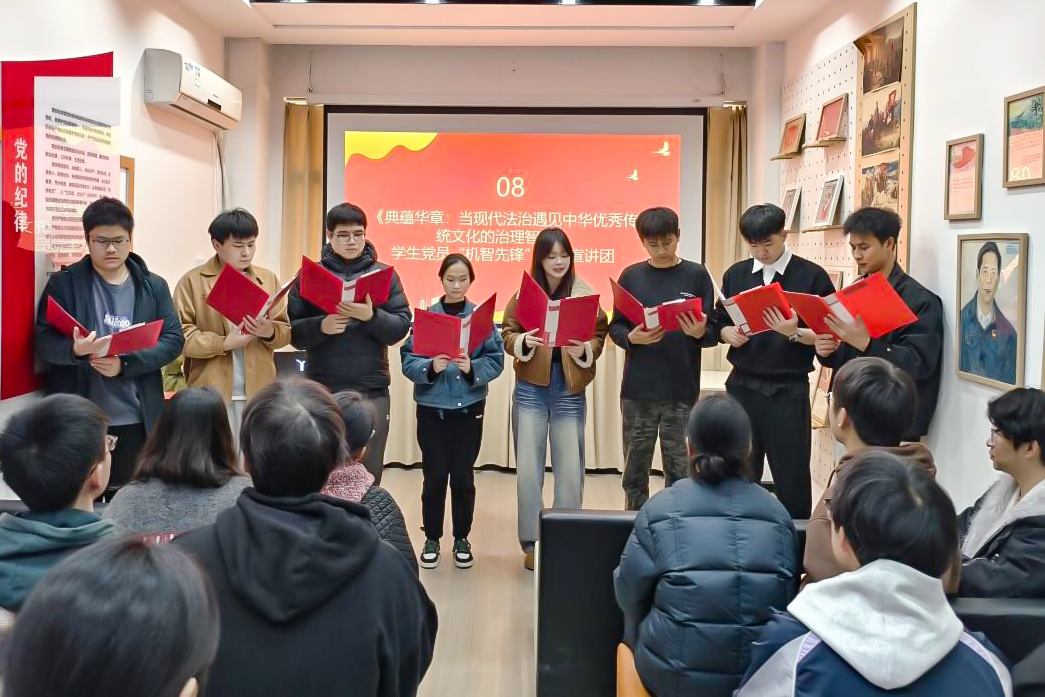 “机智先锋”理论宣讲团带来《当现代法律遇见中华优秀传统文化的治理智慧》现场展示。宣讲团成员以生动案例串联起中华优秀传统文化与现代法律体系中的治理智慧,从“德法共治”的传统理念到新时代全面依法治国的实践,多维度呈现了传统文化与现代法治的融合路径,为党员们带来了一场兼具理论深度与文化温度的理论宣讲。