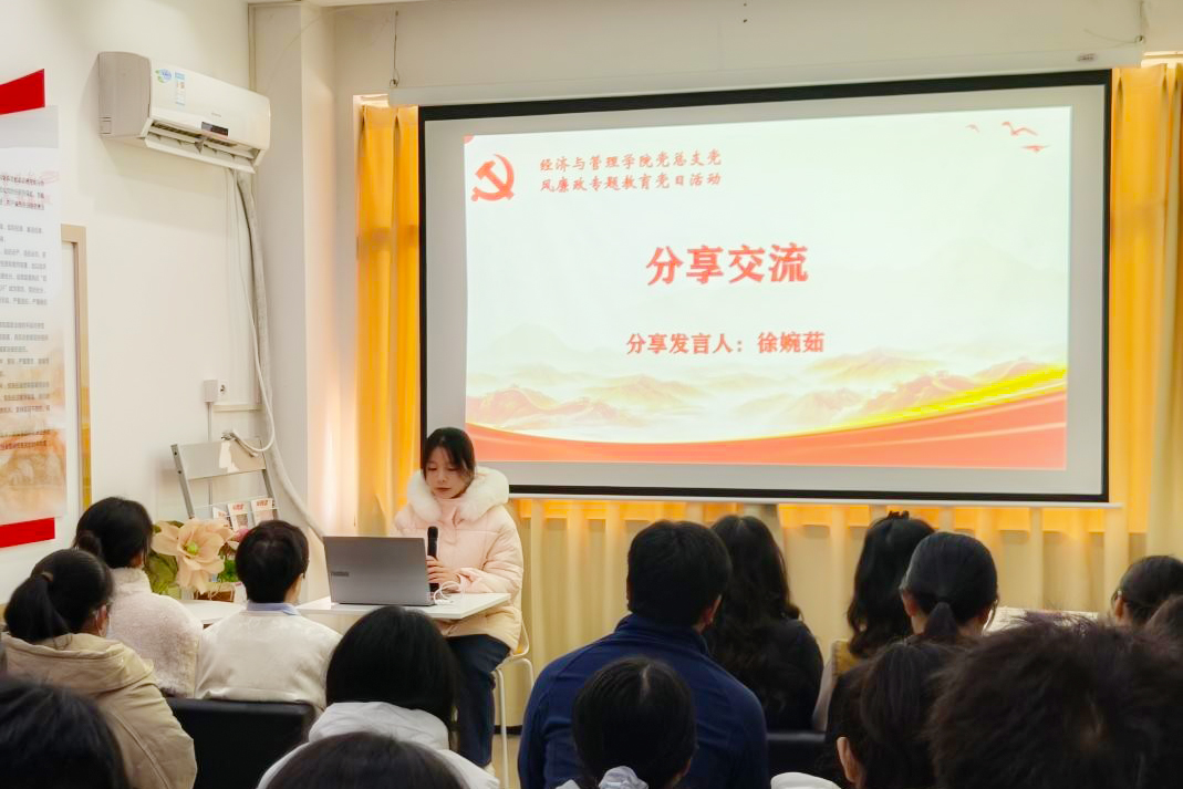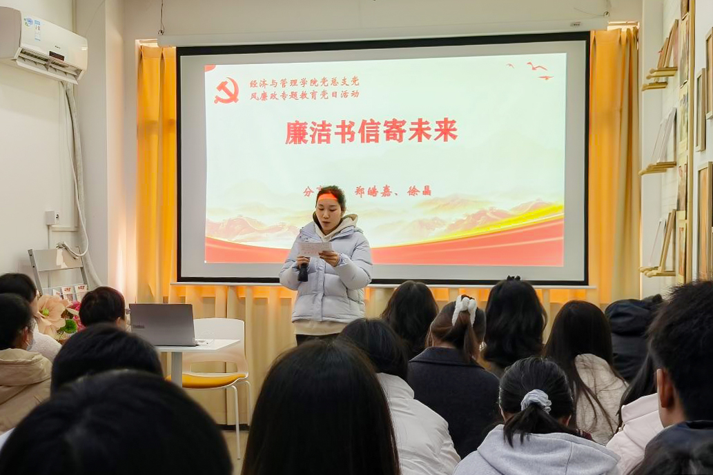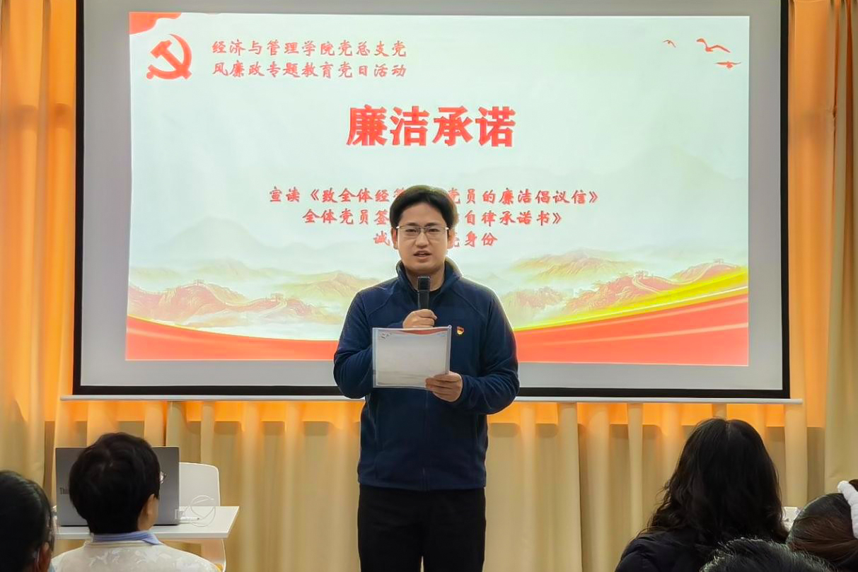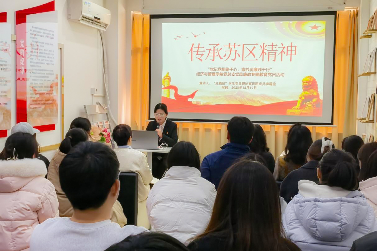 经济与管理学院党总支书记胡旷以《学条例 守党纪 自觉做忠诚干净担当的合格党员》为题讲授专题党课。她带领全体党员深入学习《中国共产党纪律处分条例》,系统阐述党的纪律规矩的核心要义与时代要求,强调要准确把握“六项纪律”,将党纪学习教育融入日常、抓在经常,切实增强政治定力、纪律定力、道德定力、抵腐定力,真正将遵规守纪内化为日常习惯和行动准绳。