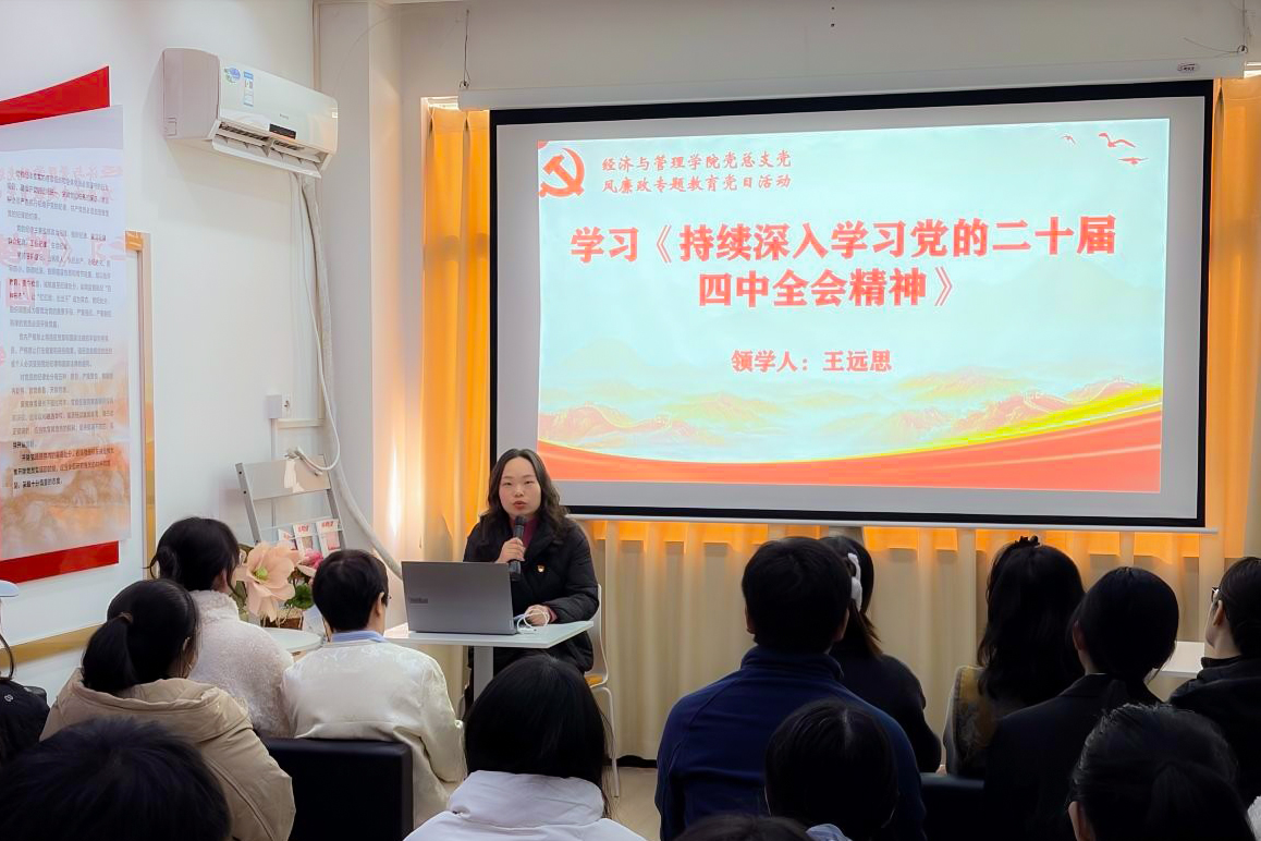 经济与管理学院党总支副书记王远思领学党的二十届四中全会精神,重点解读了全会关于“纵深推进全面从严治党”的战略部署,围绕全会精神的实践要求与育人指向,系统解读了全面从严治党的新形势、新任务及其对青年党员的时代要求。