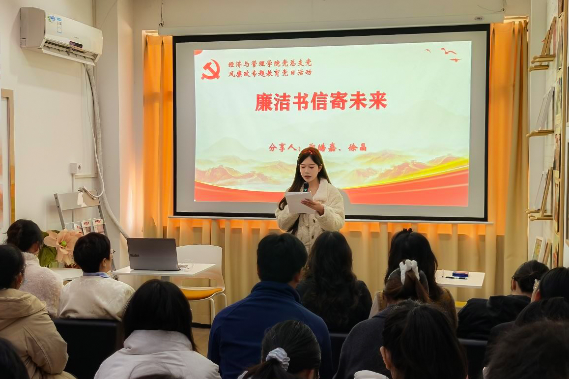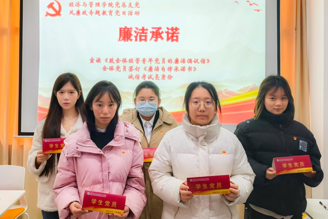 (四)活动成效 本次主题党日活动是经济与管理学院培育廉政文化品牌“青衿润廉”的生动实践。通过“党课导学、理论研学、宣讲促学、影教警学、实践践学”五维模式,学院将党风廉政建设的要求转化为青年可感知、可参与、可践行的成长教育,实现了党性锤炼、纪律教育与廉洁文化建设的有机融合,有力强化了学生党员的纪律意识与规矩意识,为其未来人生征程注入了坚定的清廉底色。经济与管理学院党总支将持续加强党风廉政建设,推动廉洁文化建设走深走实,为学院高质量发展提供坚强的纪律保障。